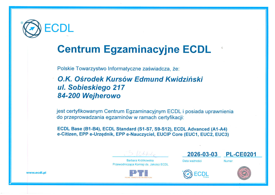 Firma szkoleniowa O.K. Ośrodek Kursów realizuje różnorodne kursy i szkolenia specjalistyczne. Współpracujemy z instytucjami samorządowymi, urzędami pracy, ośrodkami pomocy społecznej, zakładami karnymi, zespołami szkół oraz przedsiębiorstwami z terenu całej Polski.